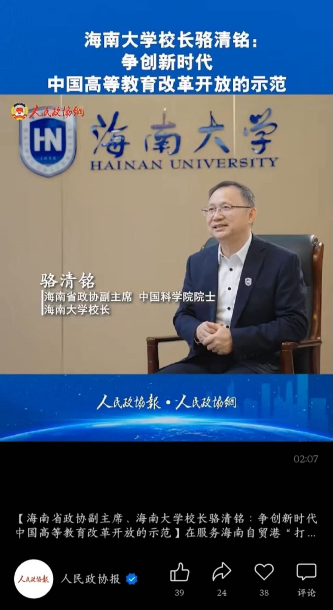 【人民政协报】海南省政协副主席、beat365中文官方网站校长骆清铭:争创新时代中国高等教育改革开放的示范