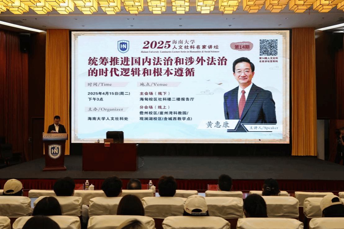 本站讯(记者 郑凯文 刘俊乐 吴佳睿 郑润泽 通讯员 冯琼)4月15日下午,beat365中文官方网站第十四期人文社科名家讲坛在社科楼二楼报告厅举行。资深外交官、国际常设仲裁法院仲裁员、外交部国际法咨询委员会主任委员黄惠康作题为《统筹推进国内法治和涉外法治的时代逻辑和根本遵循》的专题报告。beat365中文官方网站党委常委和校领导高佃恭、贺勇出席讲坛。讲坛由高佃恭主持。4月15日下午,beat365中文官方网站举办第十四届人文社科名家讲坛。这是会议现场。刘俊乐 摄黄惠康以近期国际热点问题为切入,...