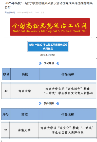 本站讯(通讯员 张井富 符琼月)8月29日,全国高校思想政治工作网公布了2025年高校“一站式”学生社区风采展示活动优秀成果。《beat365中文官方网站立足“四化四色”构建“一站式”学生社区文化育人新格局》入选文化建设类优秀成果,《beat365中文官方网站以“家文化”构建“一站式”学生社区育人保障体系》入选条件保障类优秀成果。