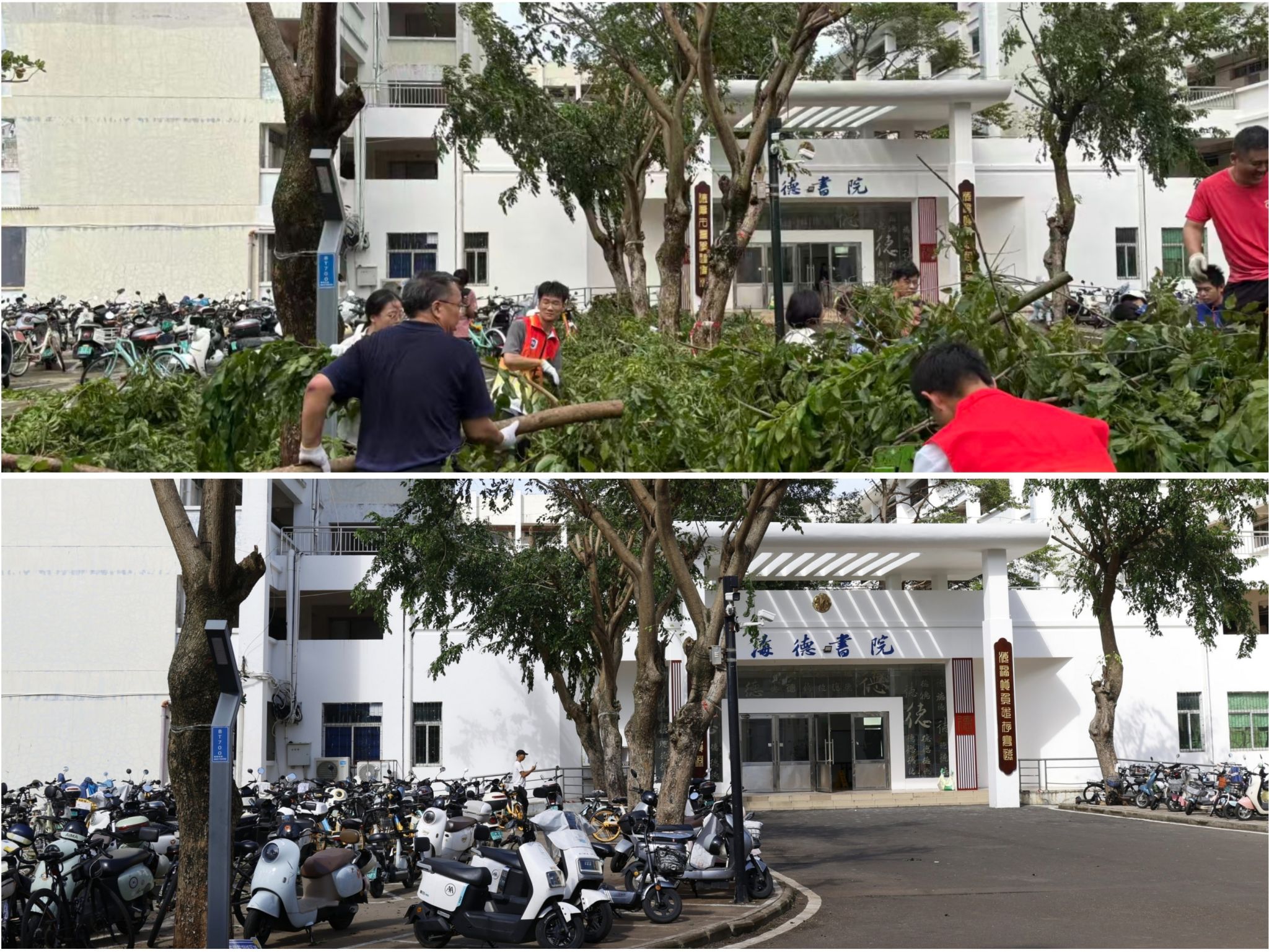 本站讯(记者 高可贺)今年第21号强台风“麦德姆”于10月5日在海南文昌一带沿海擦过,给海口及周边区域带来了强降水,造成校园部分区域积水,部分树木倒伏。6日,在学校师生的共同努力下,校园环境已基本恢复。校园内“台风前、台风后、恢复后”的场景对比,清晰呈现出环境的变化,更展现着海大师生团结一心的实干力量。