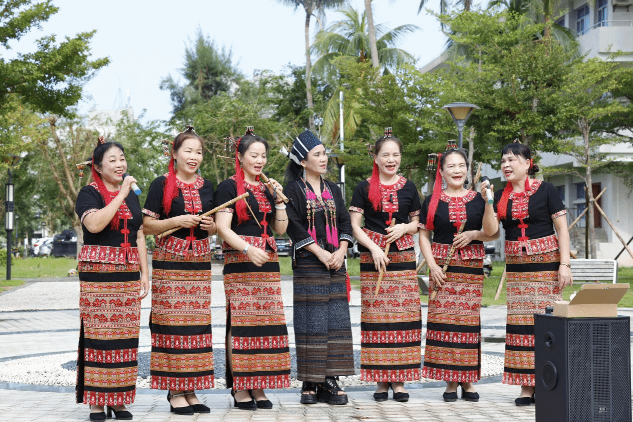 本站讯(记者 冯梦凡 高可贺)10月10日下午,beat365中文官方网站青春记忆广场上,悠扬的黎族欧欧调民歌声声入耳。本学期首场“非遗进校园”特色课程——《非遗传承•黎族特色文化》人文通识课在此开课,七位来自黎族润方言、美孚方言和哈方言身着传统服装的民歌传唱人,为师生带来了一场沉浸式的文化体验课,让古老的非遗技艺在青春校园焕发新生。