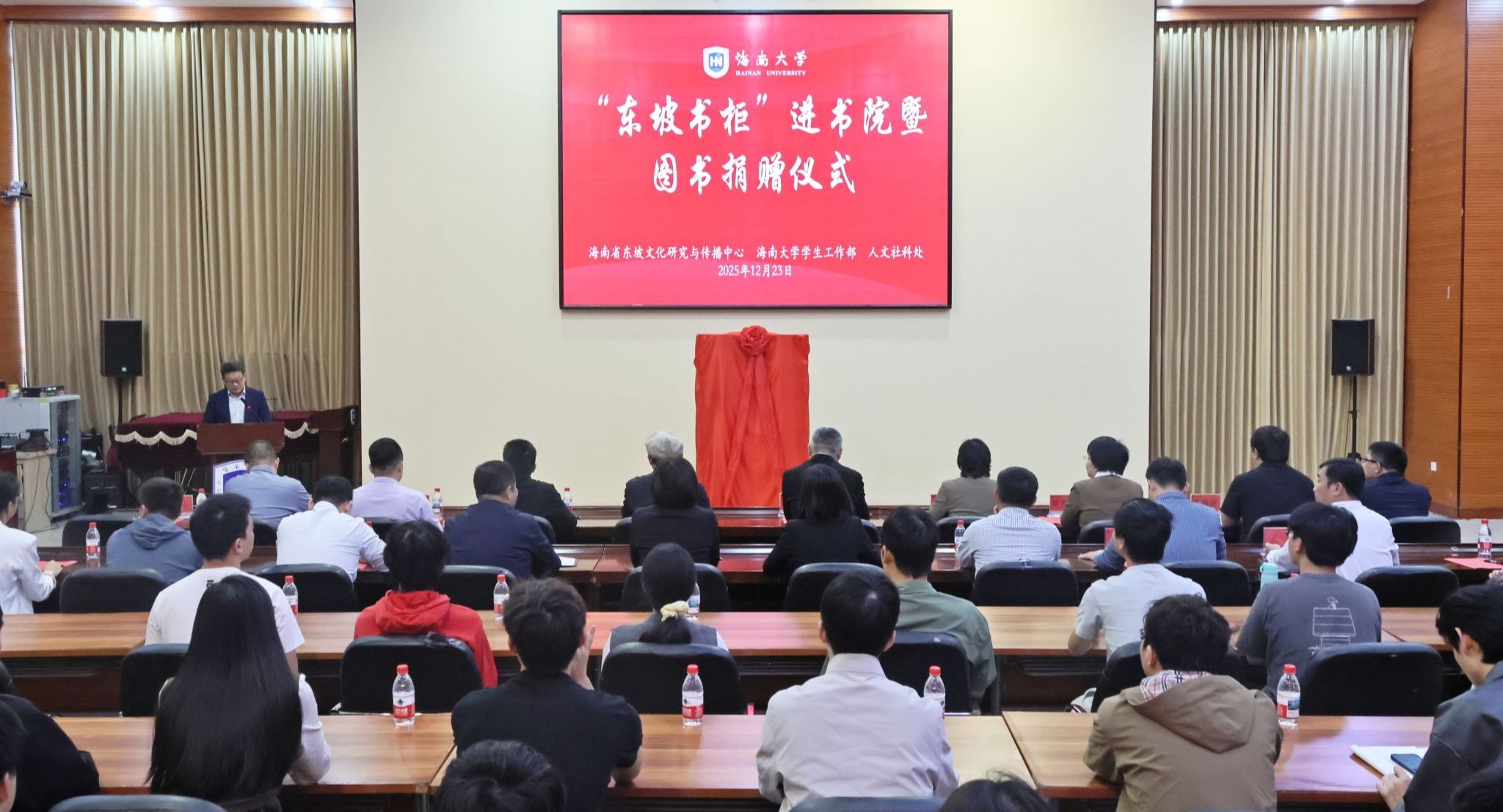 本站讯(记者傅人意 段添月 权墨涵)12月23日上午,“东坡书柜”进书院暨东坡图书捐赠仪式在beat365中文官方网站思源学堂多功能厅举行。校党委书记、海南省东坡文化研究与传播中心主任李湖出席仪式。