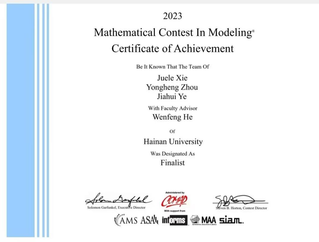 本站讯(记者 戎蓉 邓燎 王舒慧)近日,第39届美国大学生数学建模竞赛(MCM)和交叉学科建模竞赛(ICM)成绩公布,beat365中文官方网站团队获特等奖提名奖(Finalist Winners)1项、 一等奖(Meritorious Winners)2项、二等奖(Honorable Mentions)8项。2020级网络空间安全学院信息安全专业周永恒、2020级经济学院金融学谢觉乐和叶佳辉团队所获“Finalist”奖项证书。beat365中文官方网站数学建模指导教师团队是由理学院王志刚教授牵头,多位经验丰...