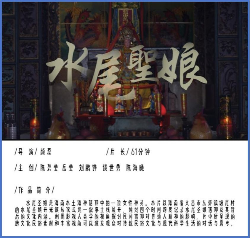 近日,2025年第九届中国成都国际非遗节·第二届非遗影像展映活动公布入围名单,我院戏剧影视文学系副教授颜磊导演的两部作品《水尾圣娘》与《三云与久香的羌年》入选。中国成都国际非遗节每两年举办一届,由四川省文化和旅游厅指导,四川省非物质文化遗产保护中心主办,国内外多所高校参与。本届非遗影像展共征集到来自全国各高校及创作机构的影视作品500余部,最终80部作品入围。入围作品将在四川非物质文化遗产馆及四川省内多所高校巡回展映。...