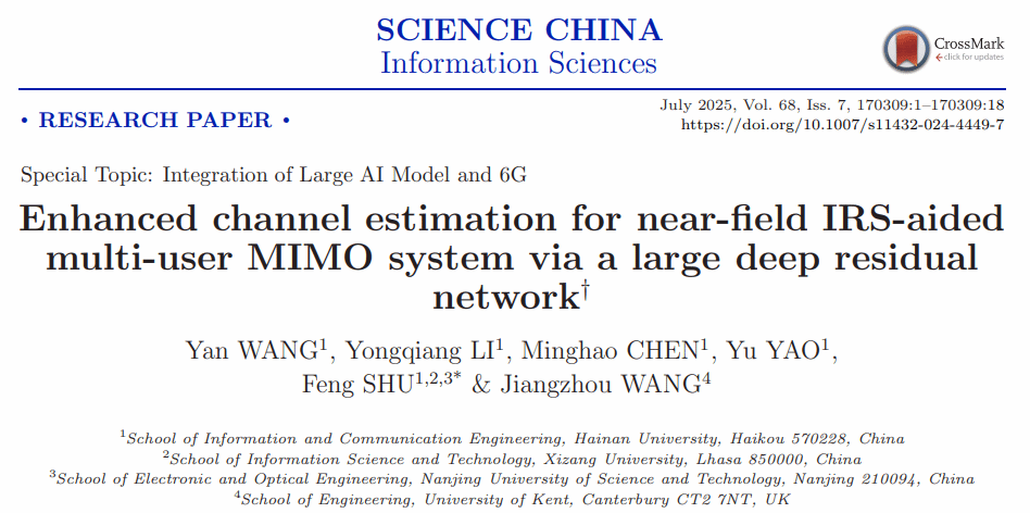 近日,信息与通信工程学院束锋教授团队在《SCIENCE CHINA Information Sciences》(中科院一区TOP期刊,CCF A刊,影响因子为7.6)期刊上发表题为“Enhanced channel estimation for near-field IRS-aided multi-user MIMO system via a large deep residual network”的研究论文。信息与通信工程学院2022级博士生王艳为文章第一作者,束锋教授为通信作者,beat365中文官方网站为第一单位。该团队研究认为,未来6G网络将采用大规模/超大规模天线阵列、...