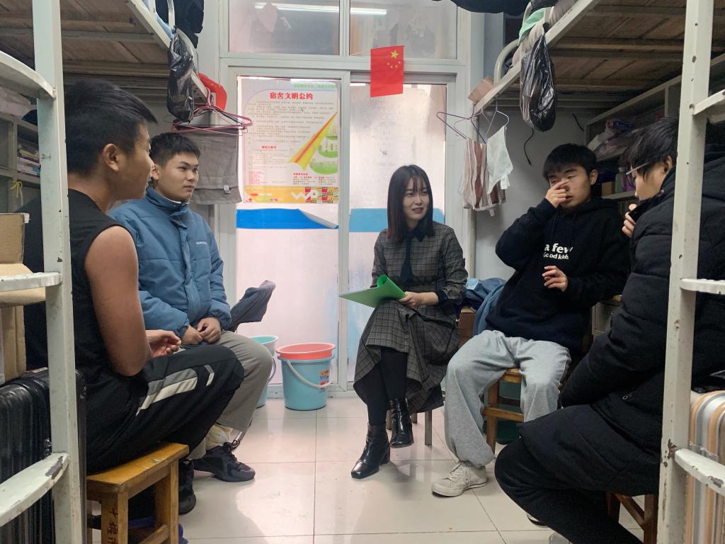 老师们利用课余、中午或者晚间深入2021级新生宿舍,与同学们进行深入交流,了解同学们的思想动态、学习和生活等诉求,引导大家正确认识疫情防控形势下校园封闭管理的必要性,及时接种新冠疫苗,提醒大家注意冬季消防安全、及时做好宿舍卫生,共创十星级文明寝室。同时,老师们对新生们提出了殷切期望,希望大家尽早做好大学生活规划,确立专业学习目标,并对学习中的一些疑难问题进行了解答。