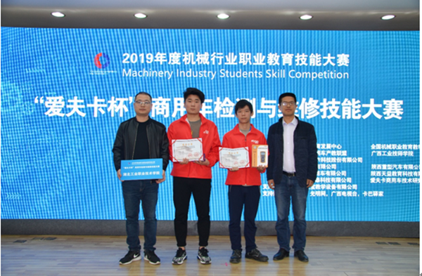 新闻网讯(通讯员 秦挽星)12月1日,2019年度机械行业职业教育技能大赛-“爱夫卡杯”商用车检测与维修技能大赛在广西工业技师学院落下帷幕,欧冠官网欧冠官方网站入口2017级汽车检测与维修技术专业参赛学生胡洋、李生龙分别荣获高职组二、三等奖。