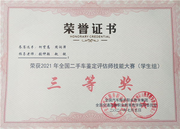 新闻网讯(通讯员 张玲 张仲颖)7月4日,2021年全国二手车鉴定评估师技能大赛(学生组)在浙江交通职业技术学院圆满闭幕。经过二手车鉴定评估实操和二手车理论考试两轮的激烈角逐,欧冠官网欧冠官方网站入口2019级“一汽-大众订单班”柯贤高、周润泽同学克服备赛时间短、天气炎热、实训车辆缺乏等困难,凭借扎实的基本功在众多院校选手中脱颖而出,获得全国三等奖的好成绩。