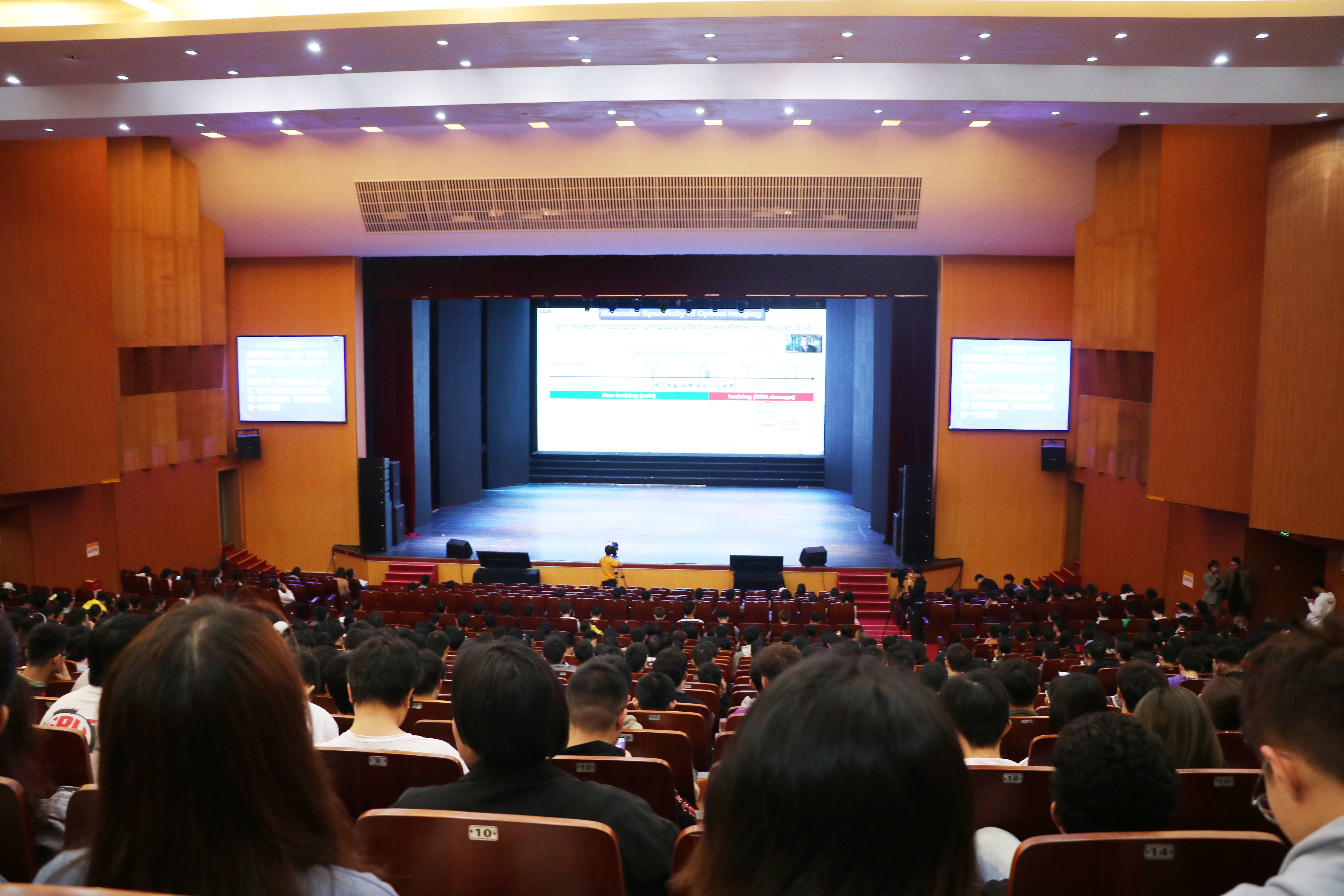 汪立宏介绍了其团队研发出的光声层析成像(PAT)技术和压缩超快摄影(CUP)技术。他指出,PAT技术可深入到生物组织内,在不同的细胞器尺度上实现全方位的功能、代谢、分子和组织学成像,达到深度观察生物组织的效果。CUP技术,可记录速度最快的自然现象,即光的传播,每秒可捕捉70万亿帧画面,比市场上在售的相机技术快10个数量级;同时,CUP技术的速度也可以放慢,记录神经传导等较慢的现象。从根本上而言,PAT技术实现了光波与超声波的结合。对于传统的散射组织高分辨率光学成像而言,其深度处于光学扩散极限(~1mm)之内,而PAT技术突破了这一极限,通过感应分子,以高超声分辨率和高光学对比度实现了深层穿透。这一技术广泛应用于癌症的早期检测和脑成像。自2010年起,与PAT技术相关的年度会议已成为美国西部光电展(国际光学工程学会主办,每年参展人数达20000人)上规模最大的会议。