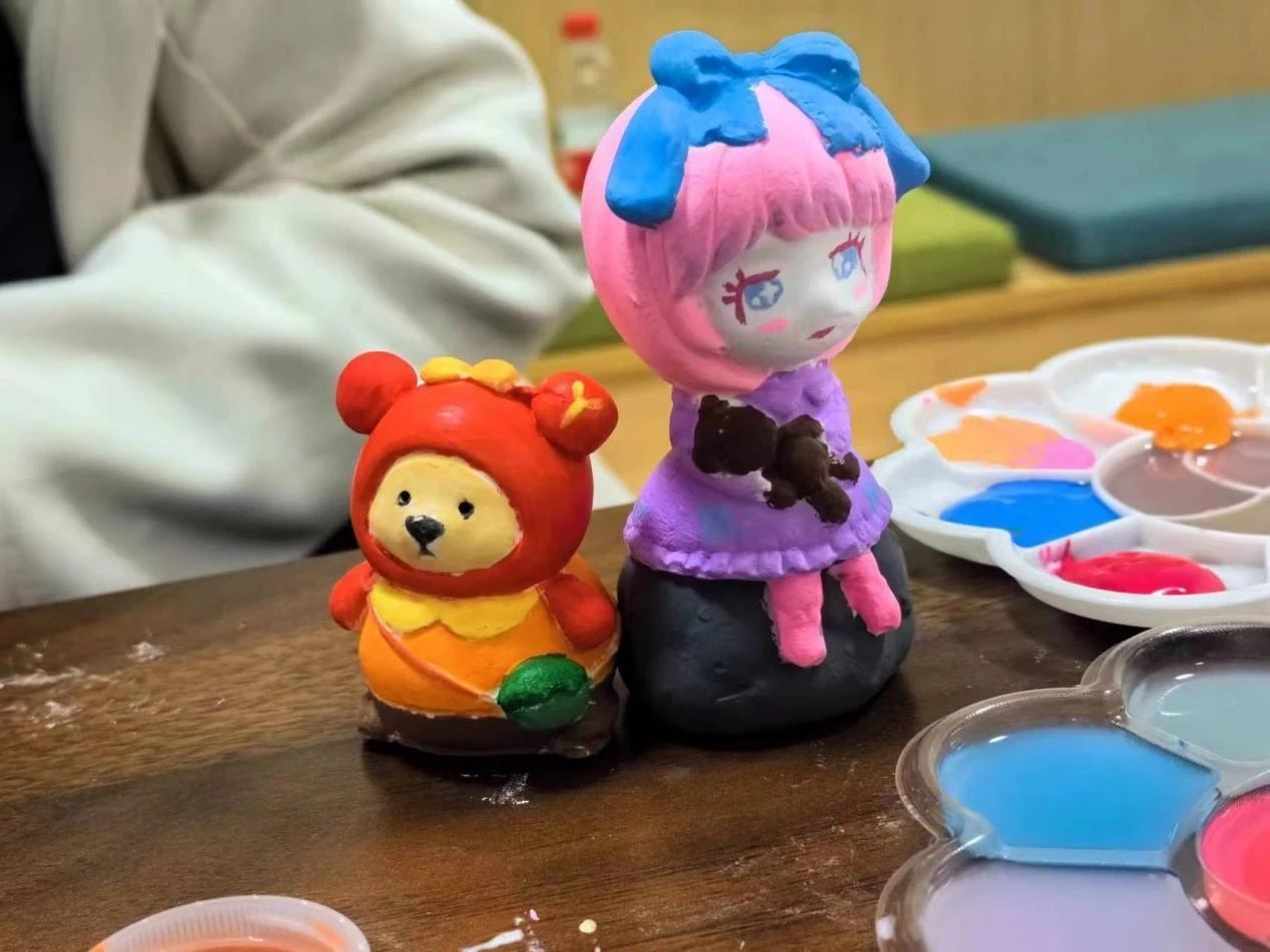 石膏彩绘是由同学们亲自用画笔和颜料,根据自己的构思和想象,对石膏像白坯进行彩绘。活动过程中,大家相互协作,互帮互助,随着彩绘石膏作品的逐渐成型,笑容也在同学们脸上愈变愈浓、愈变愈美,制作与创造的乐趣在活动室中洋溢,每一件作品都是大家心灵手巧、热爱生活的表现。石膏彩绘完成后,大家分别对自己的作品进行了展示,并将自己彩绘的作品作为收藏的小礼物。在温馨美好的氛围中,本次活动圆满结束。