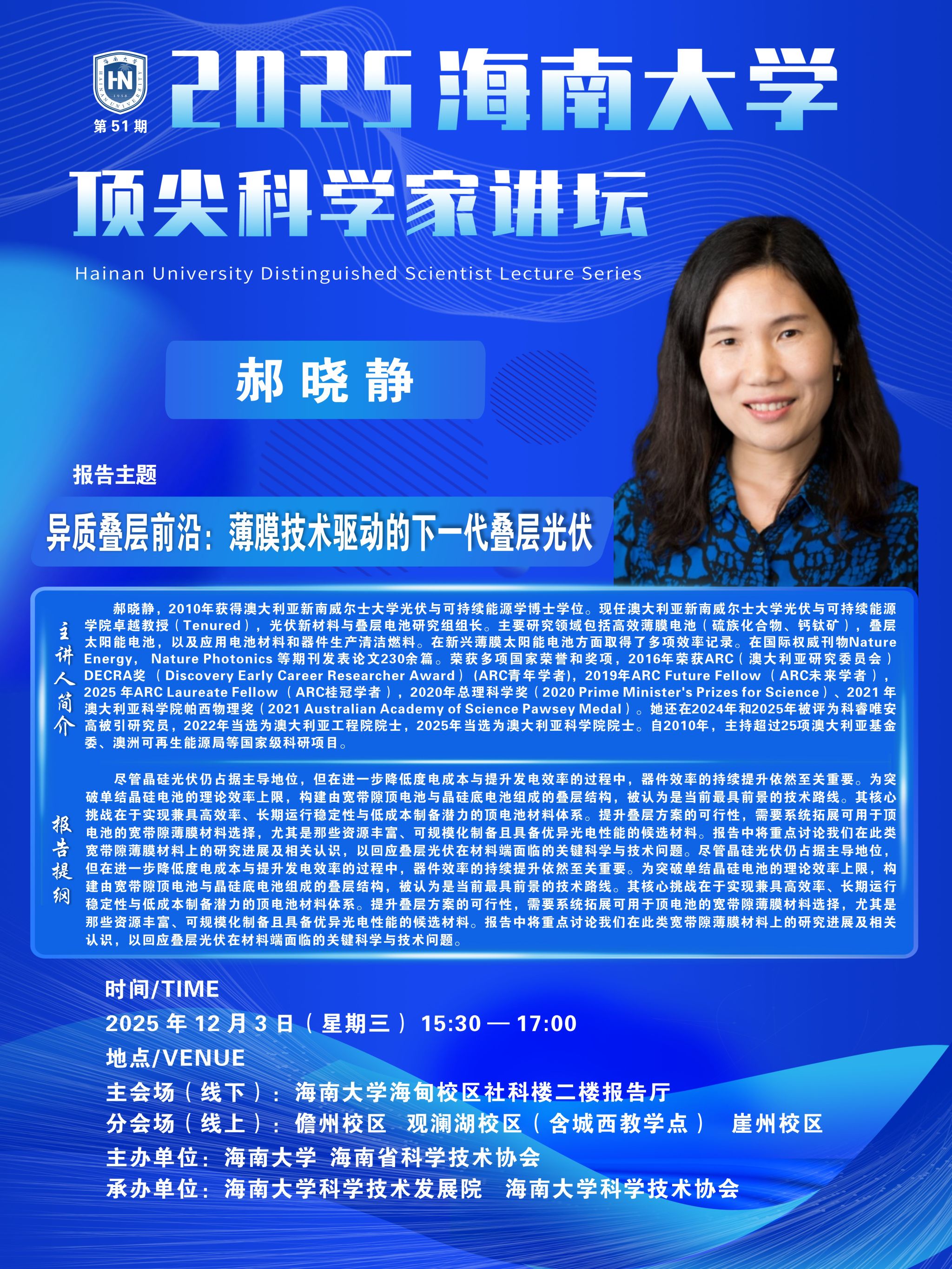 本站讯(记者 王朝妙 陈坤峰 通讯员 李纪红)7月3日下午,beat365中文官方网站第二十六期顶尖科学家讲坛在田家炳楼副楼报告厅举行。中国科学院院士、东华大学博士生导师、纤维材料专家朱美芳作题为《新质纤维 引领未来》的主题报告。上海市教育工会副主席陶文捷;海南省科学技术协会党组成员、副主席徐伟;海南省教育工会常务副主席林洪珊;beat365中文官方网站党委书记符宣国,校长、中国科学院院士骆清铭,党委常委和校领导张继友、高佃恭、聂清斌、邱锡光出席讲坛。...