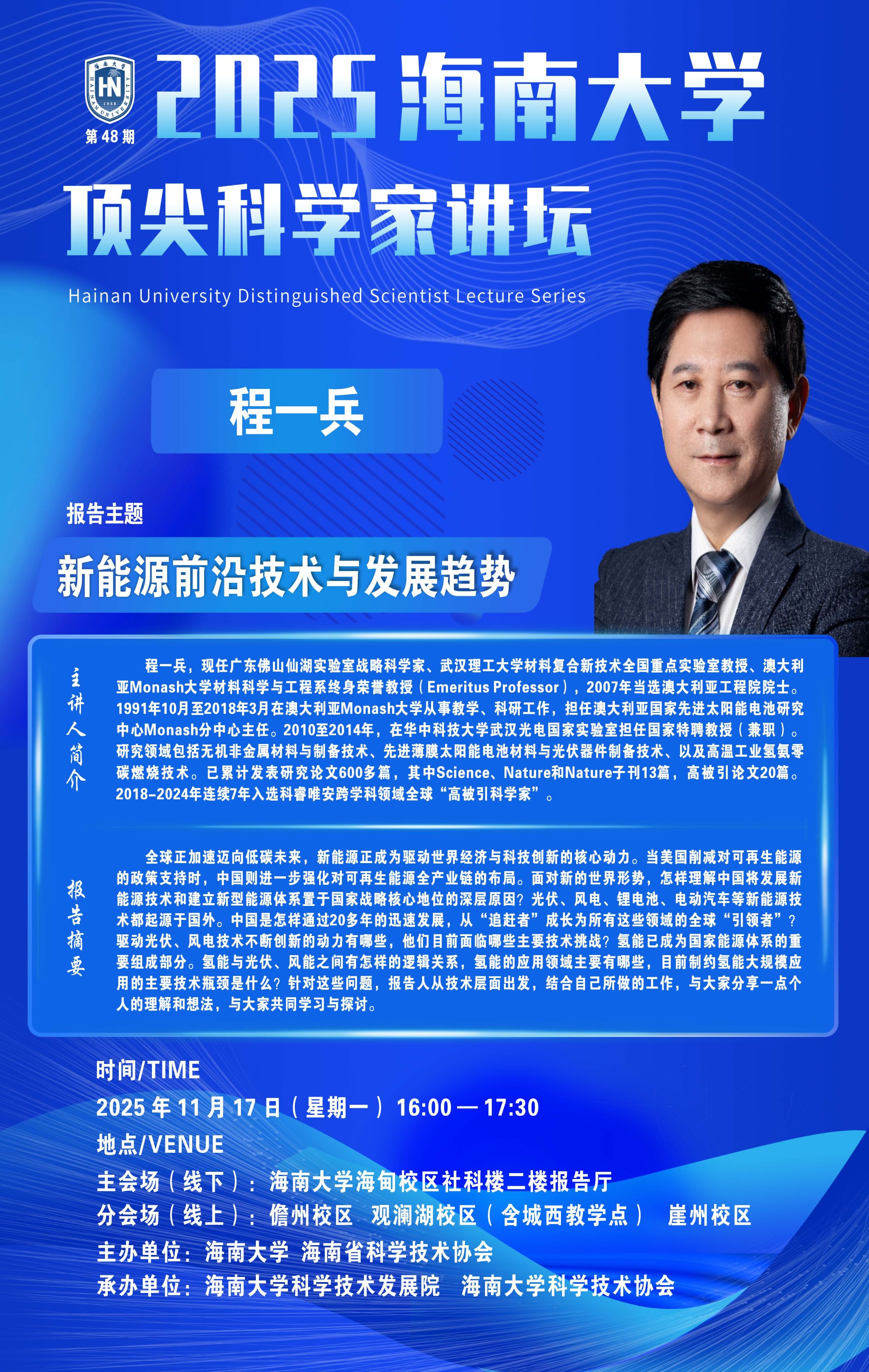 本站讯(记者 江雨 张雨晗 朱思宇 徐燕 通讯员 焦建东)9月10日下午,beat365中文官方网站第二十八期顶尖科学家讲坛在田家炳楼副楼报告厅举行。中国工程院外籍院士、香港城市大学名誉退休校长郭位作题为《七彩能源一鉴开》的学术报告。beat365中文官方网站校长、中国科学院院士骆清铭,党委常委和校领导聂清斌、邹勇华、刘谦、陈骏出席讲坛。讲坛由骆清铭主持。9月10日下午,beat365中文官方网站第二十八期顶尖科学家讲坛在田家炳楼副楼报告厅举行。朱思宇 摄郭位从生活实例和国际时事出发,...