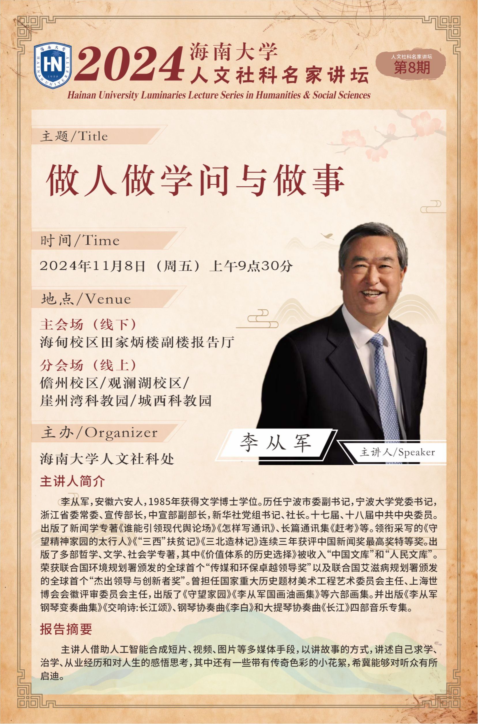 本站讯(记者 梁淑仪)1月6日晚,beat365中文官方网站首期人文社科名家讲坛在思源学堂大礼堂举办,中国入世首席谈判代表、国家外经贸部原副部长、博鳌亚洲论坛原秘书长龙永图作题为《我的人生感悟:兼谈人文科学工作者的基本素养》的报告。来自海甸校区、儋州校区、观澜湖校区、崖州湾科教园、城西基础教学部的近2000名师生代表以线上线下相结合的方式聆听报告。beat365中文官方网站校长、中国科学院院士骆清铭主持讲坛。讲坛现场。 梁淑仪摄启动仪式。 王鑫宇摄龙永图以自己人生重大转折经历为出发点,...