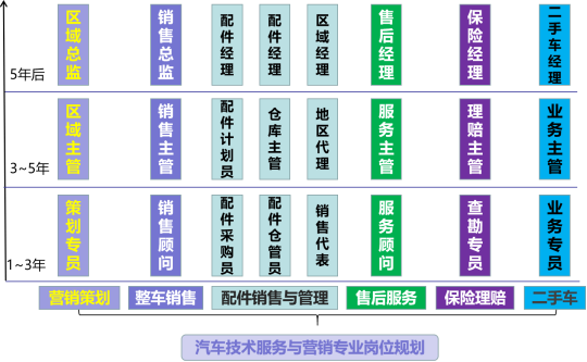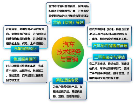 学生毕业后可进入汽车主机厂、品牌4S店、汽车卖场、汽车零配件企业、汽车维修企业、保险公司、二手车评估公司、汽车互联网公司等单位,从事汽车营销策划、销售顾问、配件销售员、仓储管理员、保修索赔员、二手车评估师、售后服务顾问、保险专员、网络营销与服务等岗位工作。